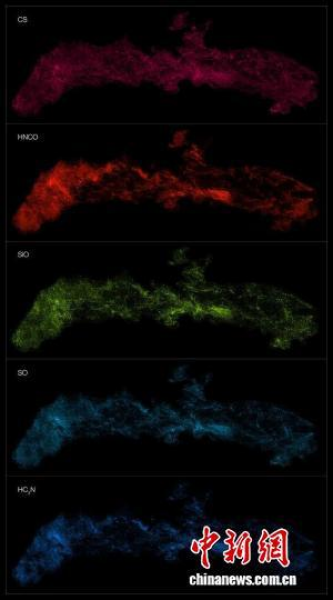 本项研究中,ALMA观测到的银河系中心不同分子分布(图片来源:ALMA〈ESO/NAOJ/NRAO〉/S.Longmore 等)。凯发k8上海天文台 供图